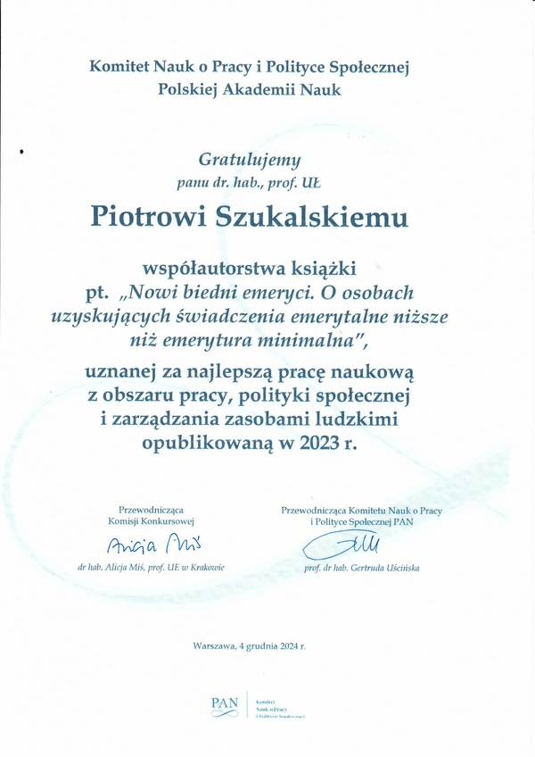 Pracownicy Wydziału Ekonomiczno-Socjologicznego wraz z badaczami Instytutu Pracy i Spraw Socjalnych w Warszawie, realizowali projekt „Nowi biedni emeryci” finansowany przez Ministerstwo Edukacji i Nauki w ramach programu „Nauka dla Społeczeństwa”. Monografie podsumowujące najważniejsze wyniki projektu zostały w tym konkursie nagrodzone.